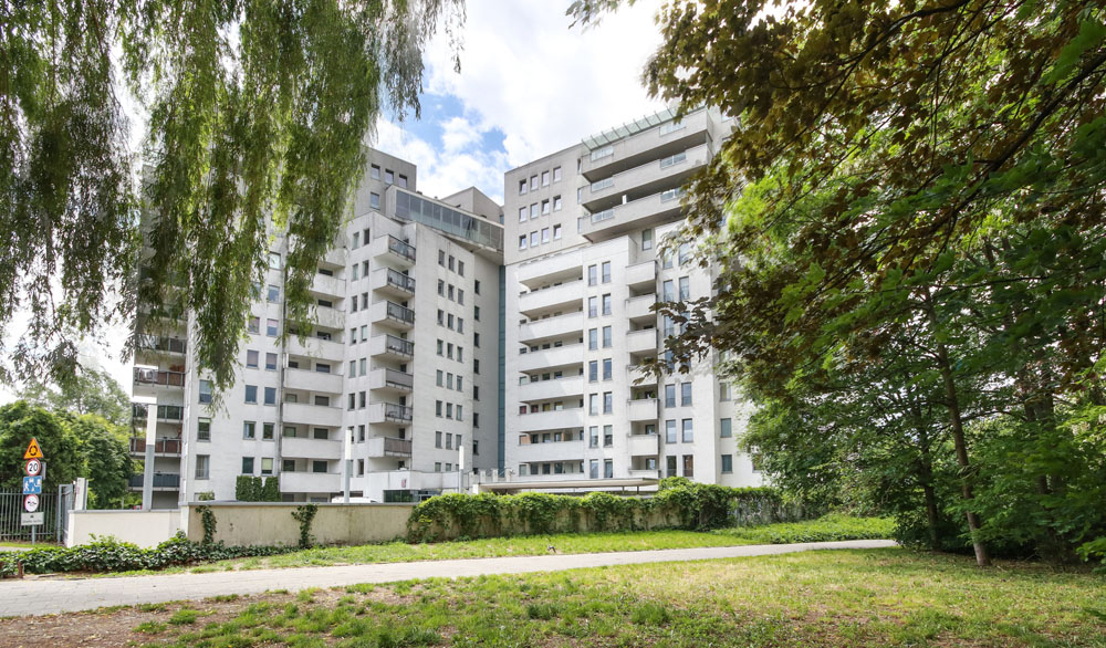 Widok z okien na zieleń, cisza, spokój na obrzeżach centrum miasta. Tuż obok ścieżki rowerowe, chodniki, leżaki, hamaki, place zabaw, skatepark itp.