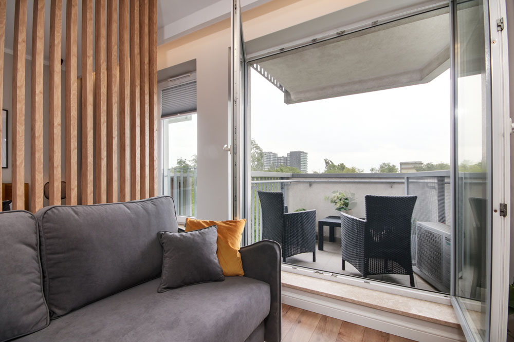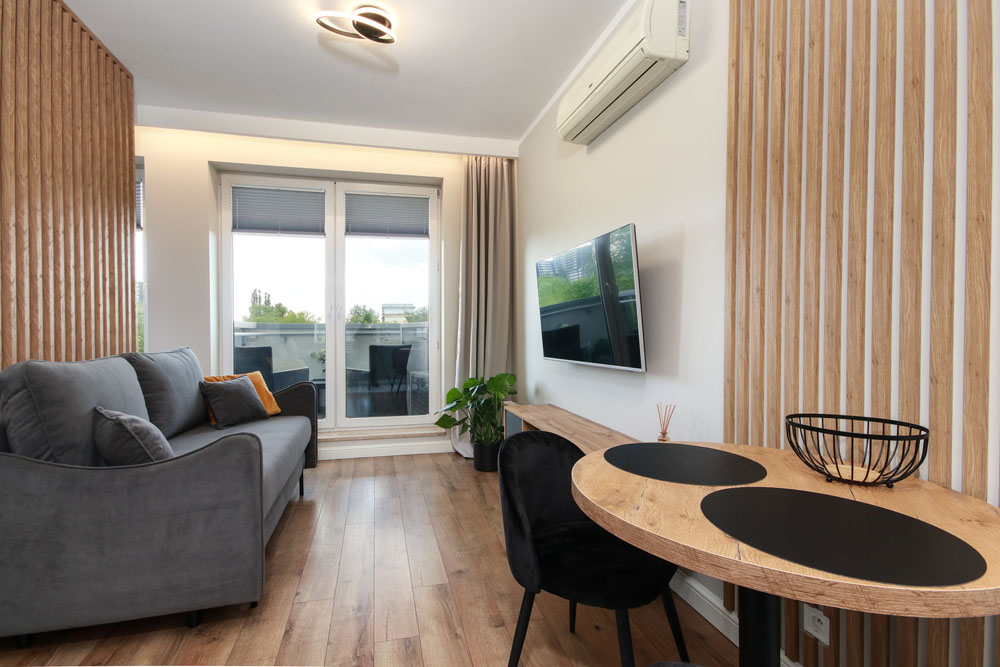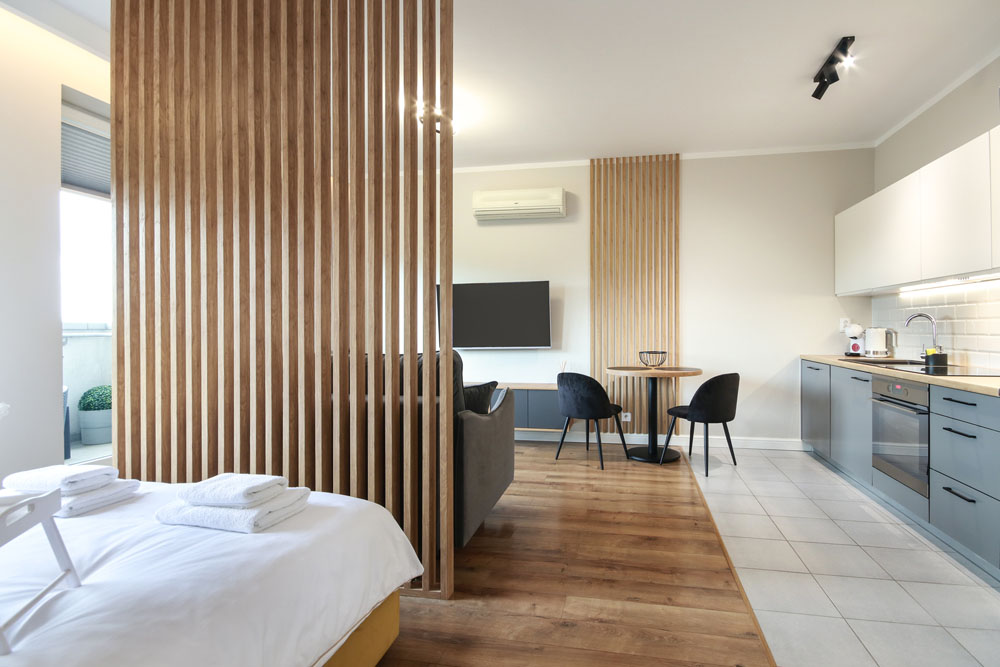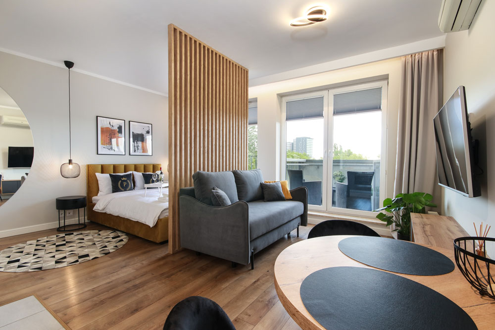 Wyjątkowy klimatyzowany apartament typu premium z dostępem do basenu i sauny. Lokalizacja blisko centrum w zielonej okolicy Parku nad Wartą. Apartament składa się z jednego pokoju z częścią wypoczynkową, sypialną oraz kuchenną i łazienki. Duże okna w pokojach. Balkon.